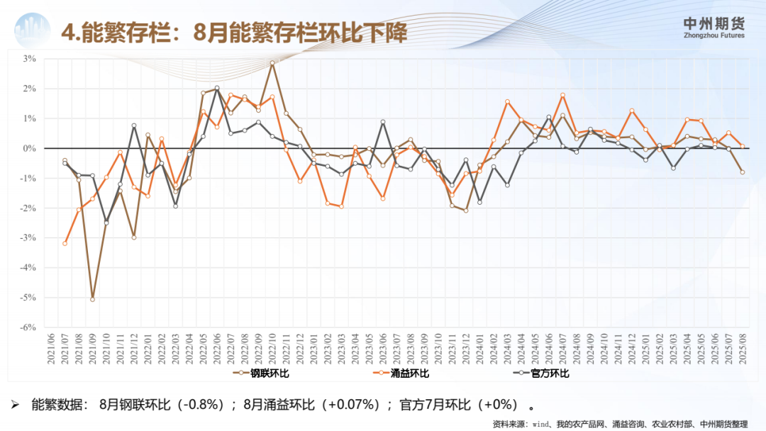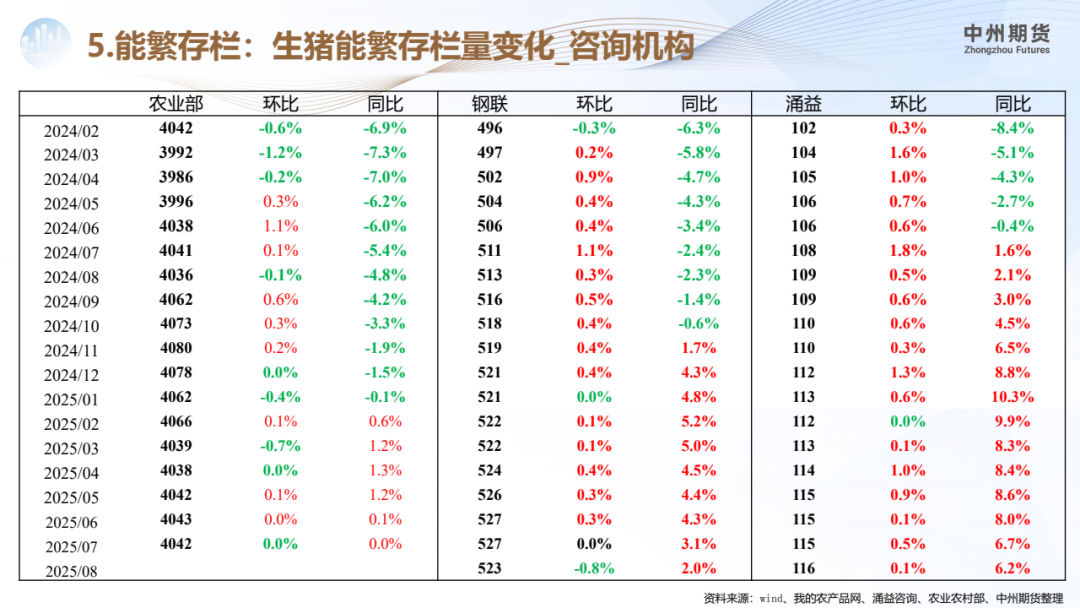 能繁母猪:官方数据,7月份全国能繁母猪存栏量为4042万头,7月环比(+0%)其他机构能繁数据:8月钢联环比(-0.8%)、涌益环比(+0.1%)。