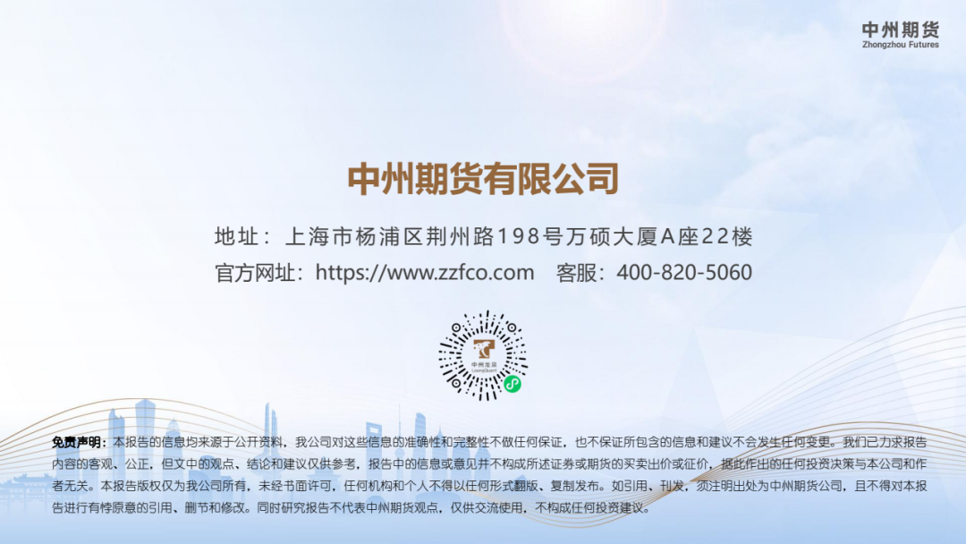 【免责声明】本报告的信息均来源于公开资料,我公司对这些信息的准确性和完整性不做任何保证,也不保证所包含的信息和建议不会发生任何变更。我们已力求报告内容的客观、公正,但文中的观点、结论和建议仅供参考,报告中的信息或意见并不构成所述证券或期货的买卖出价或征价,据此作出的任何投资决策与本公司和作者无关。本报告版权仅为我公司所有,未经书面许可,任何机构和个人不得以任何形式翻版、复制发布。如引用、刊发,须注明出处为中州期货公司,且不得对本报告进行有悖原意的引用、删节和修改。