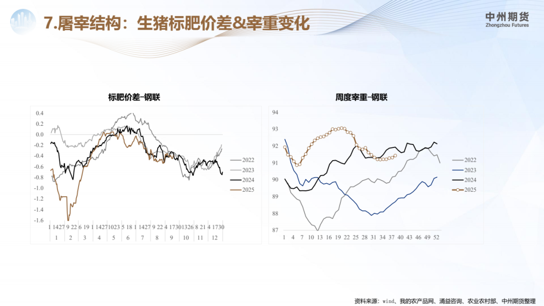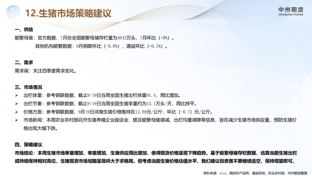 市场结论:本周生猪市场宰量增加,宰重增加,生猪供应周比增加,使得现货价格呈现下降趋势。基于能繁母猪存栏数据,估算当前生猪出栏或持续保持相对高位,生猪现货市场短期呈现供大于求格局。但考虑当前生猪价格估值水平,我们建议投资者不要继续追空,保持观望即可。