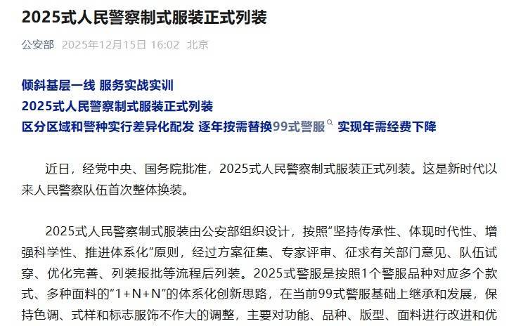 据了解,99式警服列装20多年来,在保障人民警察依法有效履职方面发挥重要作用,但随着我国经济社会发展进步和政法公安工作形势任务变化,已难以完全满足政法公安工作需要,警服款式功能、品种体系、材料工艺、配发标准等需改进和完善。新中国成立以来,人民警察制式服装共经历9次较大的改革,分别是50式警服、55式警服、58式警服、66式警服、72式警服、83式警服、89式警服、99式警服、2025式警服。历次警服改革充分展现人民警察队伍在党的领导下发扬传统、顽强奋斗的成长史,其间变化的是警服样式,不变的是人民警察对党忠诚、服务人民、执法公正、纪律严明的政治本色和初心使命。